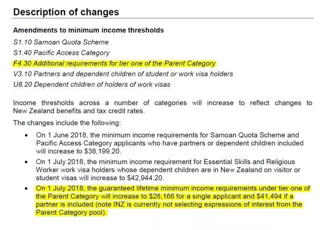 18年5月30日,沉寂了两年了新西兰父母团聚移民政策出现了最新变动——18年7月1日起,『第一类申请人(Tier one)中不常用的“父母的终身收入”标准小幅提高,单人$28,166,如果夫妻两人申请,则合计$41,494』。